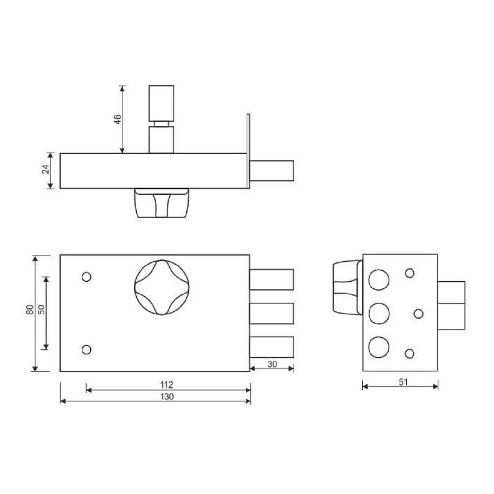 Замок накладной цилиндровый с вертушкой. Предназначен для установки на деревянные двери. Засов из трех цилиндрических ригелей диаметром 14 мм, с максимальным вылетом 30 мм. Удаление ключевого отверстия - 60 мм.