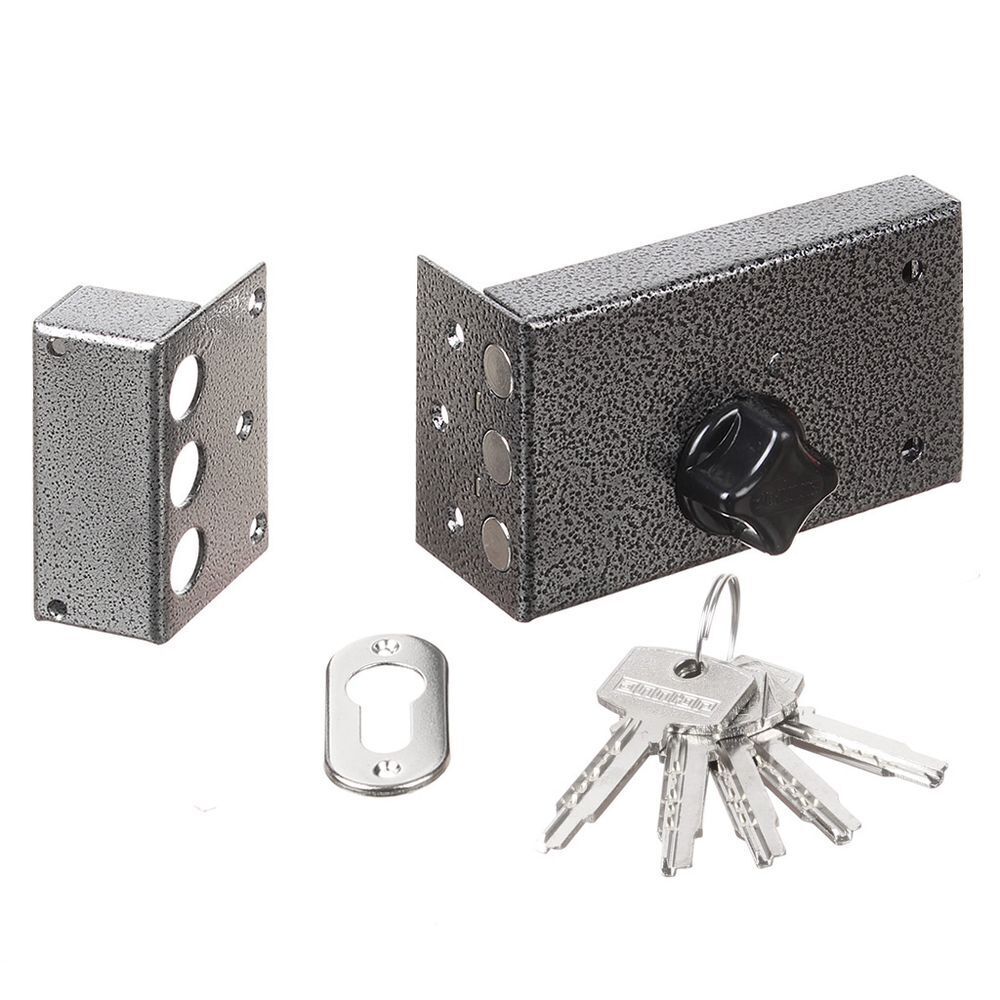 Замок накладной цилиндровый с вертушкой. Предназначен для установки на деревянные двери. Засов из трех цилиндрических ригелей диаметром 14 мм, с максимальным вылетом 30 мм. Удаление ключевого отверстия - 60 мм. Габариты замка - 130х80х24 мм. Комплектация - 5 ключей, запорная планка, накладка. Механизм замка под перфо-ключ, идет совместно с корпусом. Закрывание и открывание замка изнутри производится вертушкой, снаружи ключом.