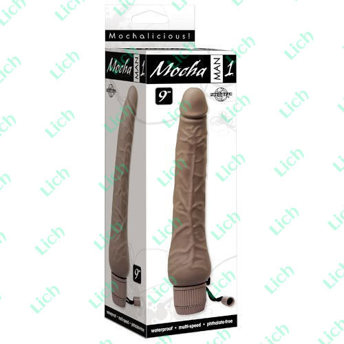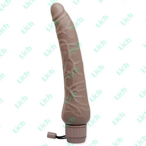 Водонепроницаемая игрушка-вибратор цвета какао. Массажер имеет немного изогнутую форму, тело вибратора покрыто объеными венками. Длина от пульта управления 22 см. Диаметр 2,5 см до 4,5 см. Работает от двух батареек типа АА.