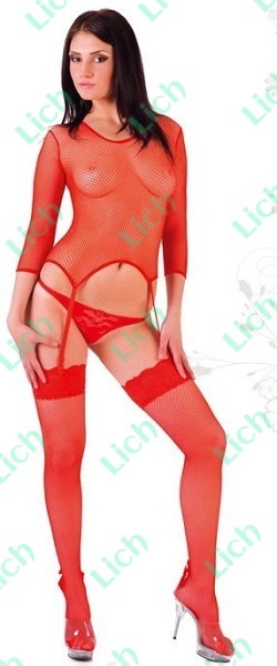 Этот комплект из трех предметов поможет вам сделать встречу с любимым более яркой. Мужчине наверняка захочется ласк красавицы, верхнюю часть тела которой закрывает полупрозрачная ткань. А под ней и нежные ручки, и упругая грудь с возбужденными сосками, и мягкий животик с бархатистой кожей. Чтобы образ был особенно сексуальным, к бюстье прилагаются чулочки с кружевной резинкой (лучшее облачение для ножек!), а также маленькие кружевные трусики. Размер S-M-L. Эластичный сетевой (чулочное плетение) комплект представляет собой бюстье с длинными рукавами, трусики, чулочки с кружевной резинкой.