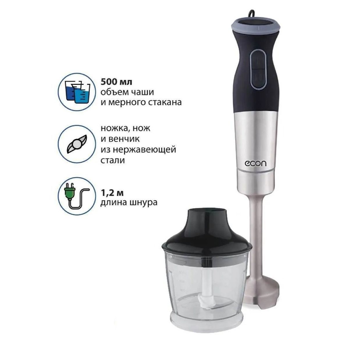 Комплектация: блендер, съемная насадка-венчик, мини-измельчитель, мерный стакан, руководство по эксплуатации, гарантийный талон.