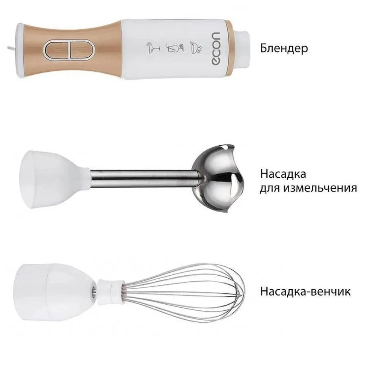 Простой и удобный погружной блендер с венчиком ECON ECO-232HB поможет измельчить продукты в любой чаше, тарелке или кастрюле, взбить или смешать продукты с помощью насадки венчика, и при этом не займет много места на вашей кухне.