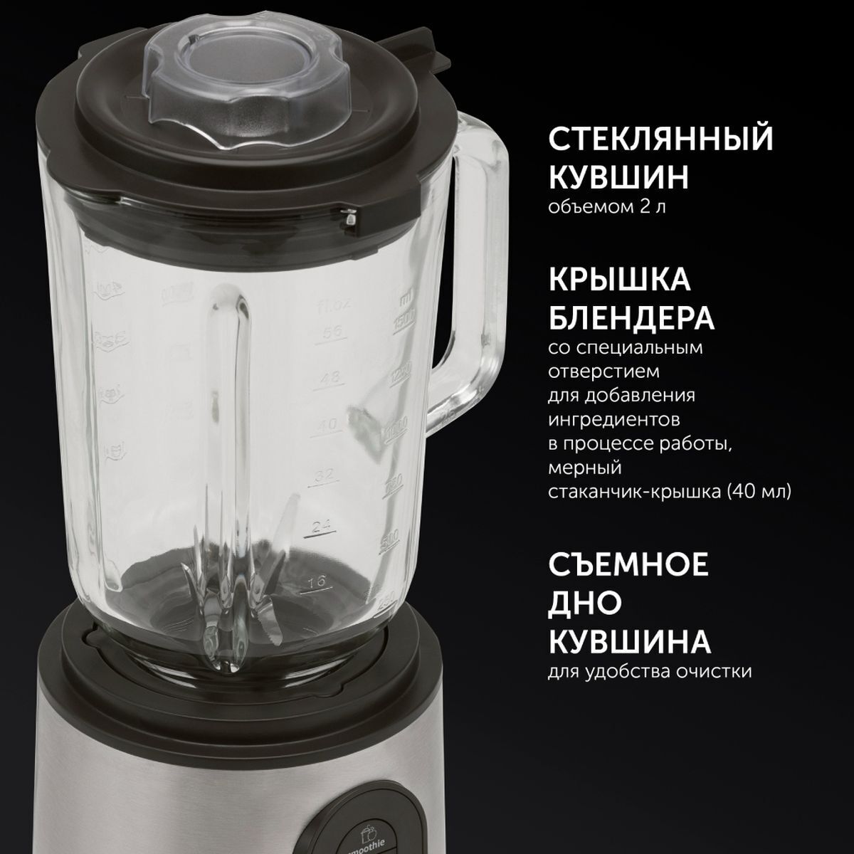 Стеклянный кувшин объемом 1500 мл выглядит эстетично, имеет носик для аккуратного переливания смеси и эргономичную ручку. Смузи и напитки удобно брать с собой в специальном дорожном стакане с крышкой-поильником, включенным в комплект.