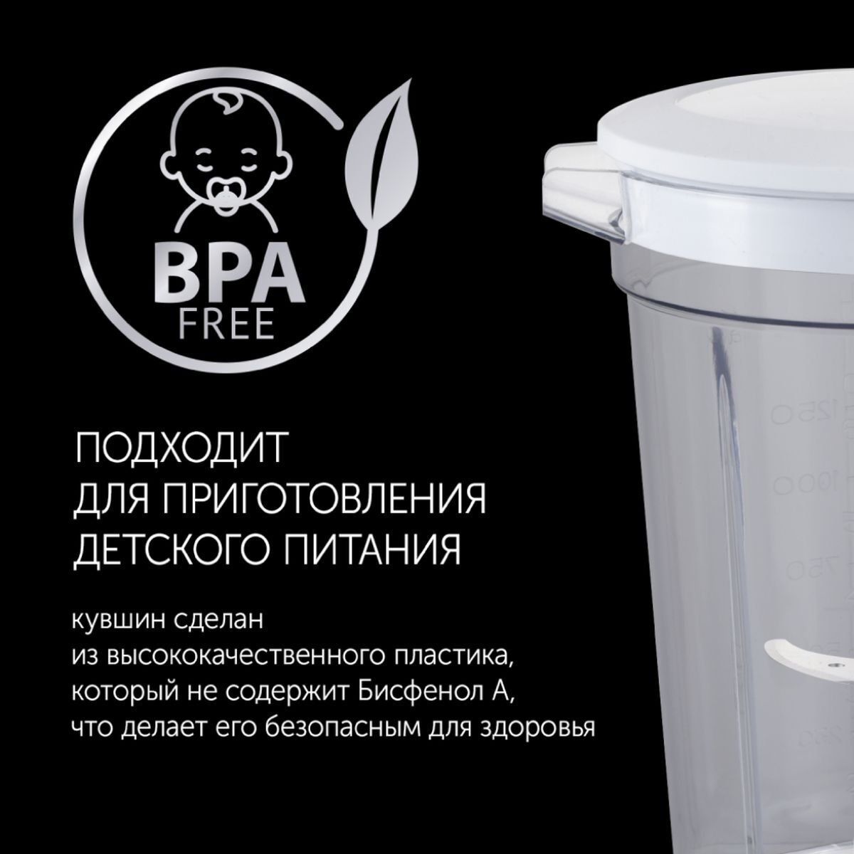 Чаша устройства изготовлена из полностью безопасного пластика, в производстве которого не используется вредный бисфенол А, она не потемнеет, не окрасится соком. Высокопрочный пластик не пахнет, не меняет вкус еды, может применяться для приготовления детского питания.
