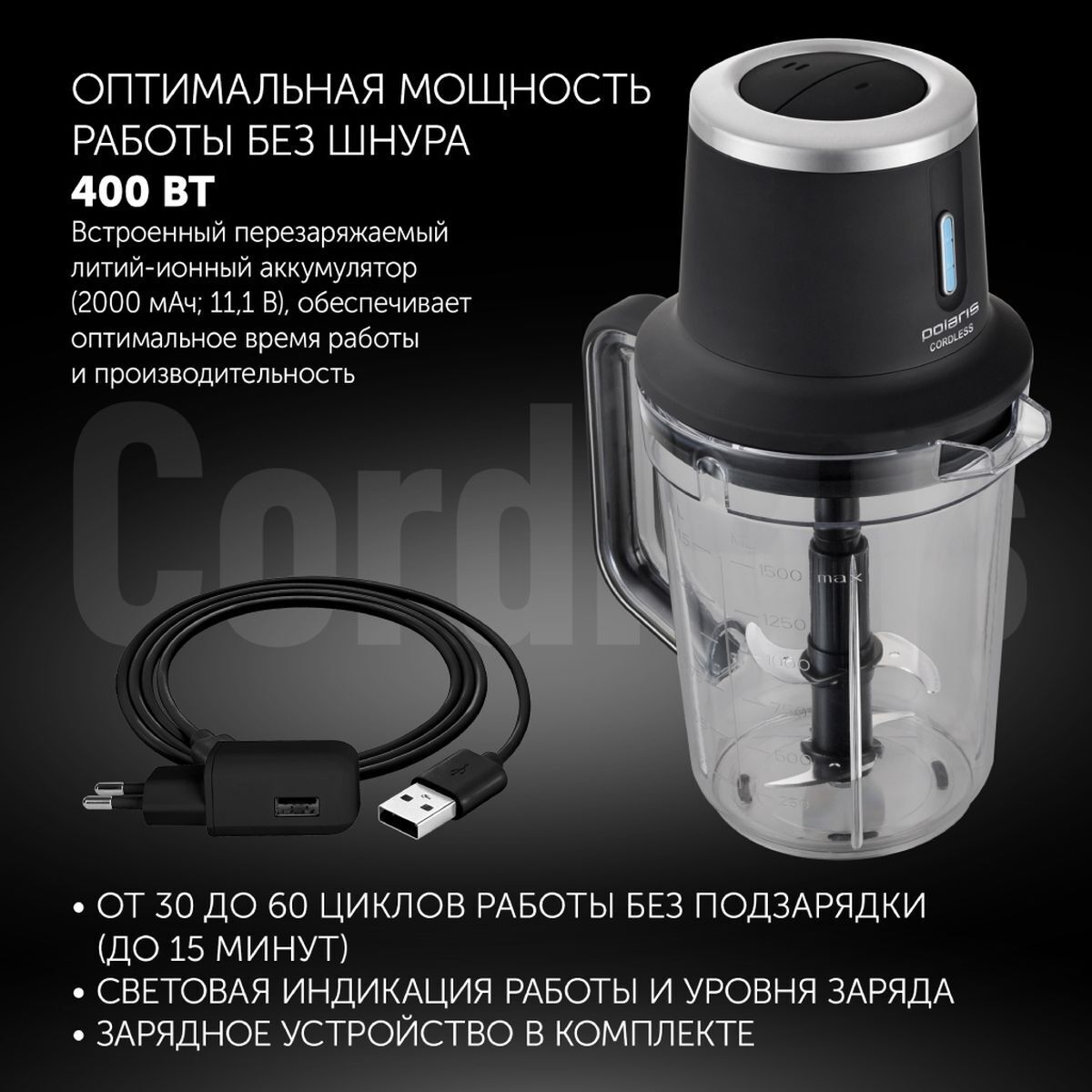 Вращает ножи мотор с мощностью 400 Вт. На одном заряде аккумулятора прибор может провести до 60 циклов запуска. Этого хватит, чтобы приготовить обед из нескольких блюд на большую компанию. Восполнить ресурс батареи можно за 5 часов. Зарядное устройство в комплекте.