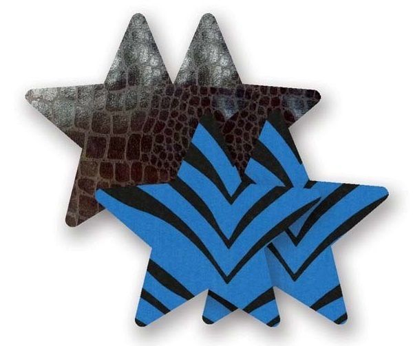 Комплект из 1 пары черных пэстис-звезочек под змеиную кожу и 1 пары синих пэстис-звёздочек в полоску