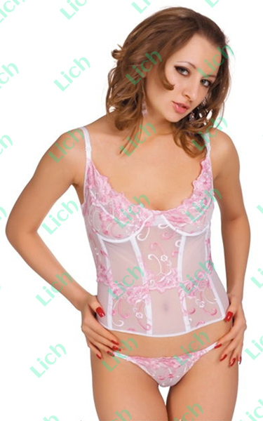 Сетевое бюстье на регулируемых бретельках, чашки на косточках, с цветочной вышивкой, в комплекте трусики-стринг. Размер: S-L. Цвет: белый с розовым. Торговая марка эротического белья EROLANTA уже завоевала популярность и успешно продается во многих сексшопах России. Коллекция подобрана так, что может удовлетворить запросы покупателей разных вкусов и предпочтений. Это и сексуальные корсеты, откровенные боди, воздушные и прозрачные пеньюары, интересные и оригинальные секси-трусики, игровые фантазийные костюмы, прозрачные кружевные комплекты и корсеты, соблазнительные комбинации и пеньюары, украшенные рюшами, вышивкой и декоративными жемчужинами. Любительницы мини подберут себе яркое прозрачное платье в комплекте с трусиками-стринг, отделанное пикантной шнуровкой. Вся продукция упакована в стильную и презентабельную картонную упаковку, что позволяет выглядеть коллекции белья EROLANTA ярко и оригинально. Знатоки ценят бельё EROLANTA за достойное качество и его невысокую цену. Название, состав и другая необходимая информация на упаковке представлена на русском языке, что соответствует российскому законодательству, а само бельё имеет соответствующие сертификаты качества. Оптовые продажи эротического белья EROLANTA.