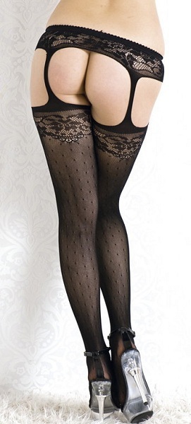 Эти высокие чулочки подчеркнут красоту ваших ножек. Черный цвет и узор из точек делают их совершенными – бесконечно длинными и стройными. Плюс этих чулочек еще и в надёжной фиксации. Что бы вы ни вытворяли – танцевали, садились на мужчину верхом – чулки не спадут вниз благодаря пояску.