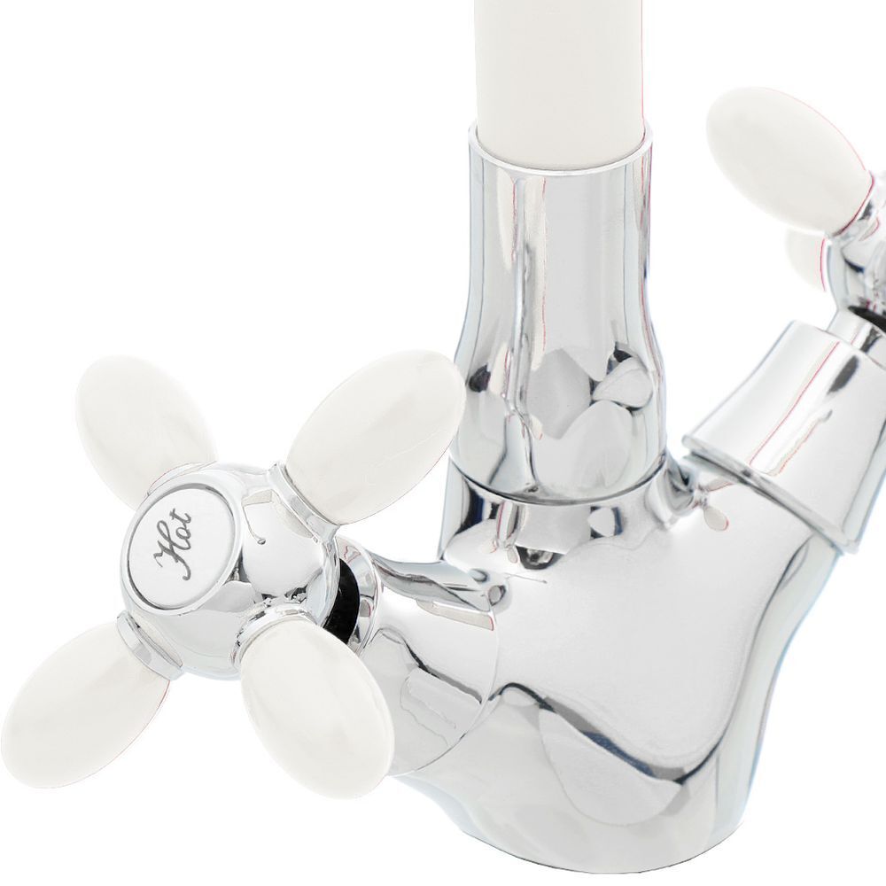 Очарование двухвентильных смесителей Frud, выполненных в ретро стиле из белого металла с хромом, невозможно не оценить. Превратить ежедневную процедуру приготовления еды в истинное наслаждение, можно дополнив интерьер кухни изящным смесителем из этой коллекции.