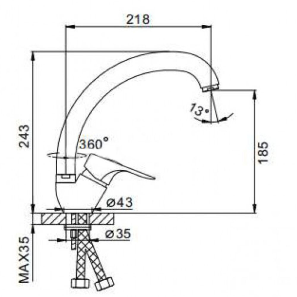 Frap смеситель для кухни, излив высокий, поворотный, однорычажный керамический катридж 35 мм, крепление на шпильках, корпус силуминовый, покрытие хром, гибкая подводка.