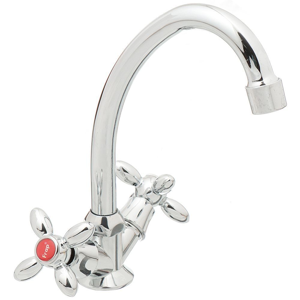 Frap смеситель для кухни, излив высокий, поворотный, двухвентильный, керамические кран-буксы, покрытие хром, крепление шпилька, гибкая подводка 1/2.