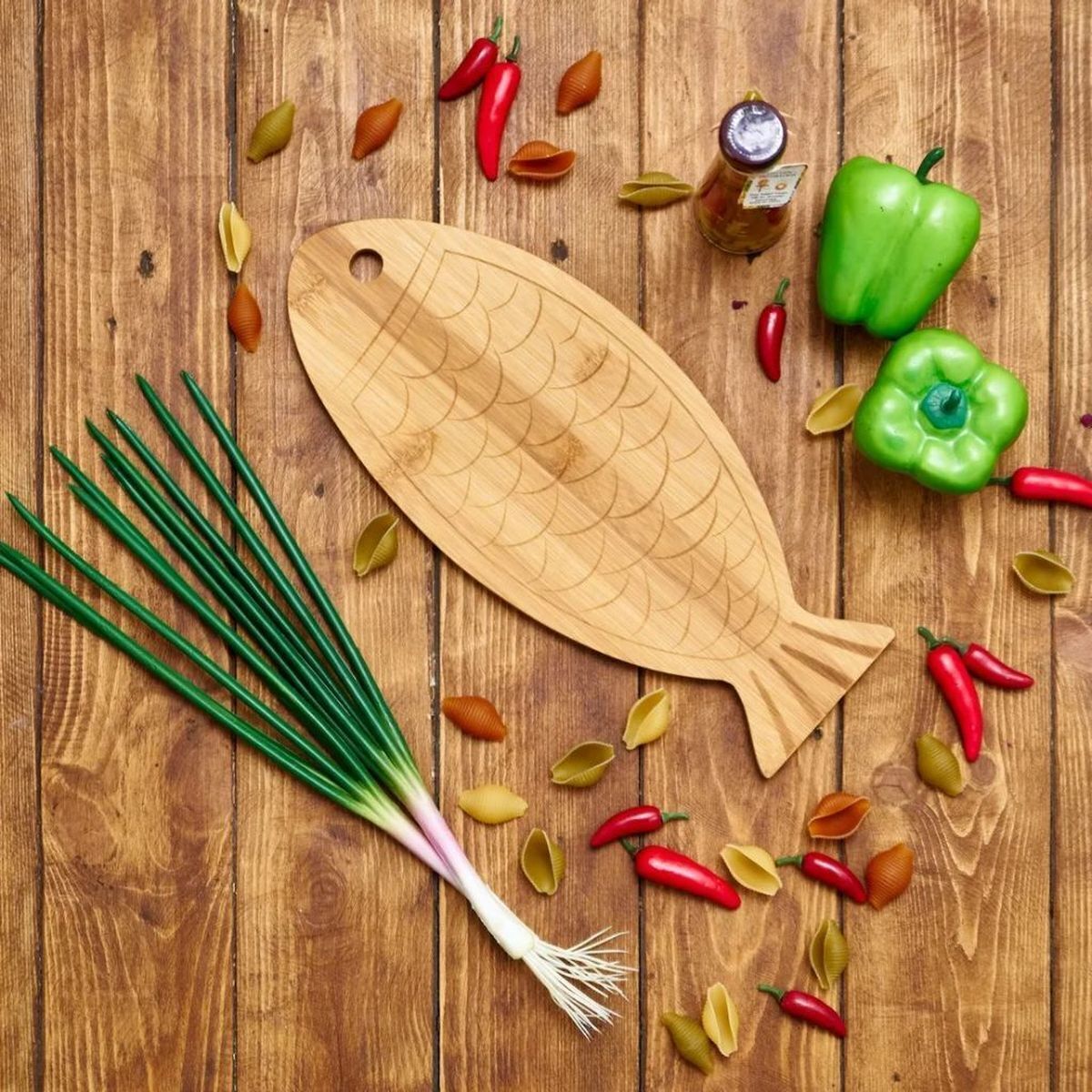 Классическая разделочная доска в форме рыбы из комбинированных оттенков массива бамбука, обладающего высокими прочностными характеристиками. Бамбук - экологически чистый материал, он ценится за устойчивость к нагрузкам и влагостойкость. Подходит для нарезки любых продуктов. Не скользит по поверхности стола, не впитывает запахи и влагу.
