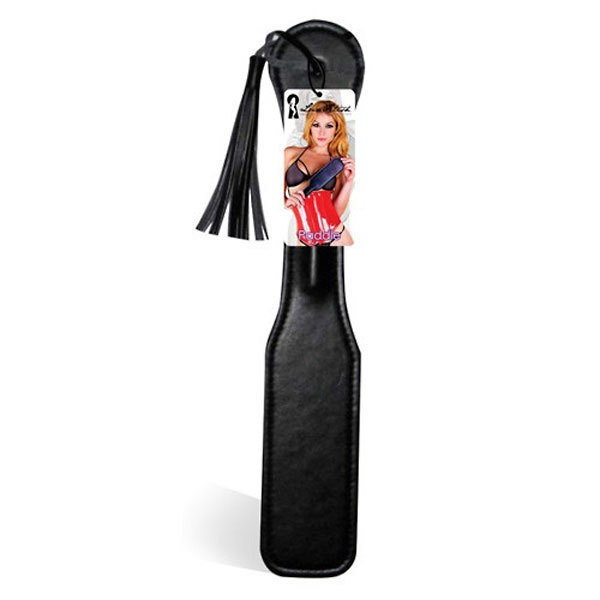 Черный тонкий пэдл-шлепалка для эротических игр! На конце спанкера кисточка. Длина жесткой шлепалки - 31 см вместе с рукоятью. Ширина ударной части - 5,5 см.