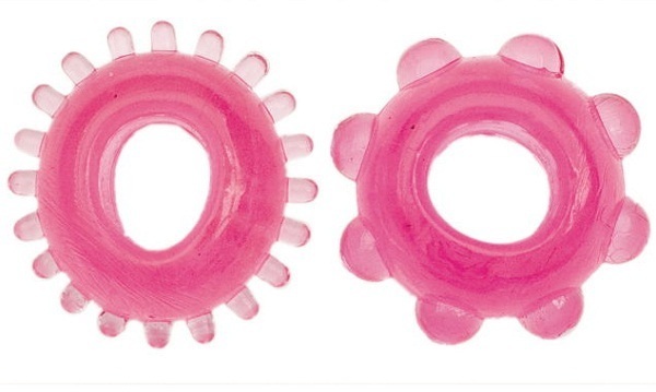 В набор входит два колечка: одно с крупными шишечками, а второе с мягкими шипами. Каждое из них гарантирует отличную эрекцию (за счет препятствия оттоку крови от полового члена), а также благодаря рельефу - отличную стимуляцию преддверия вагины. Внешний диаметр 4 см., внутренний 2,5 см.