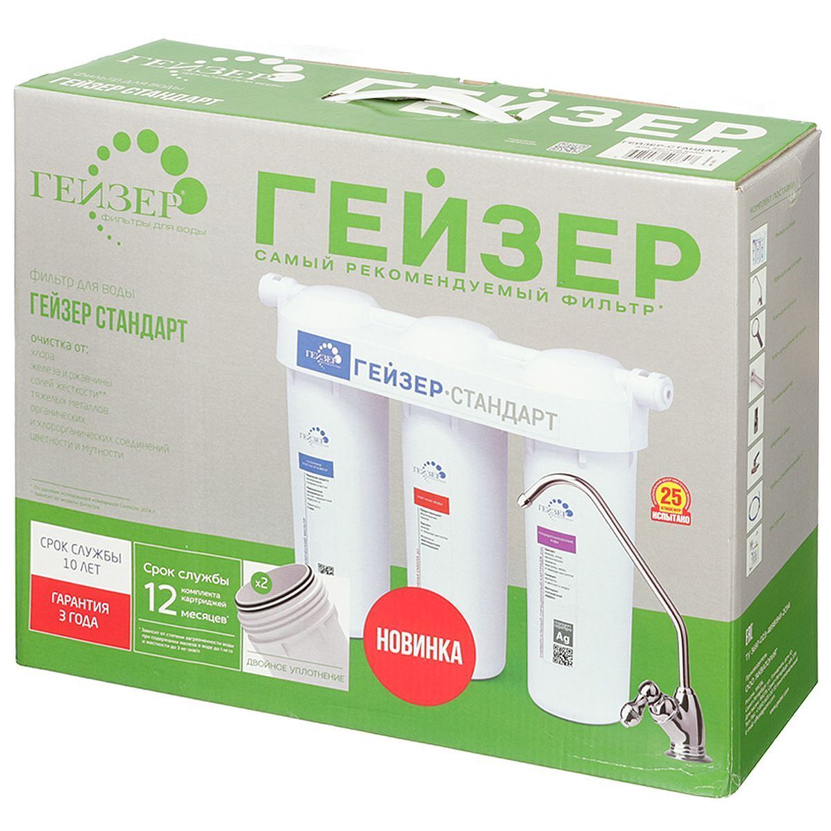 Фильтры Гейзер Стандарт очищают водопроводную воду от железа, взвешенных частиц, мутности, цветности, хлора, тяжелых металлов, органических соединений, избытка солей жесткости и других примесей.