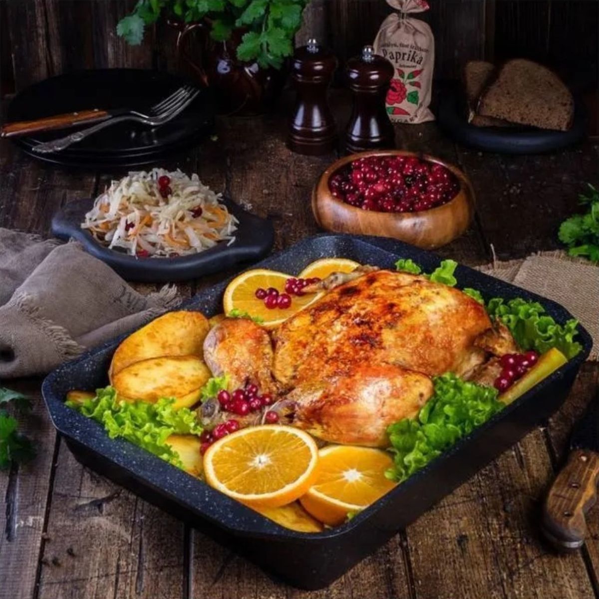 Противень позволяет готовить в духовом шкафу пироги и рулеты, различные овощные, мясные, рыбные блюда. За счет оптимальной толщины стенок и дна обеспечиваются равномерное нагревание посуды и эффективное пропекание. Благодаря антипригарному покрытию предотвращается прилипание ингредиентов, что способствует удобному извлечению пищи из противня. Качественный алюминий, который применяется для производства, характеризуется прочностью. Материал устойчив к внешнему воздействию, образованию деформации, поэтому потребительские свойства и первоначальный вид модели сохраняются в течение всего срока использования. Удалить загрязнения с изделия можно вручную или в посудомоечной машине.