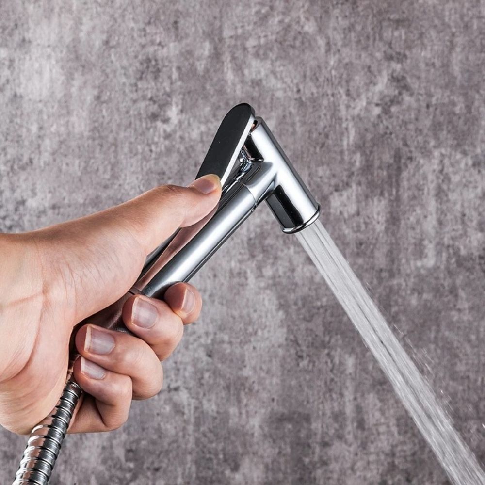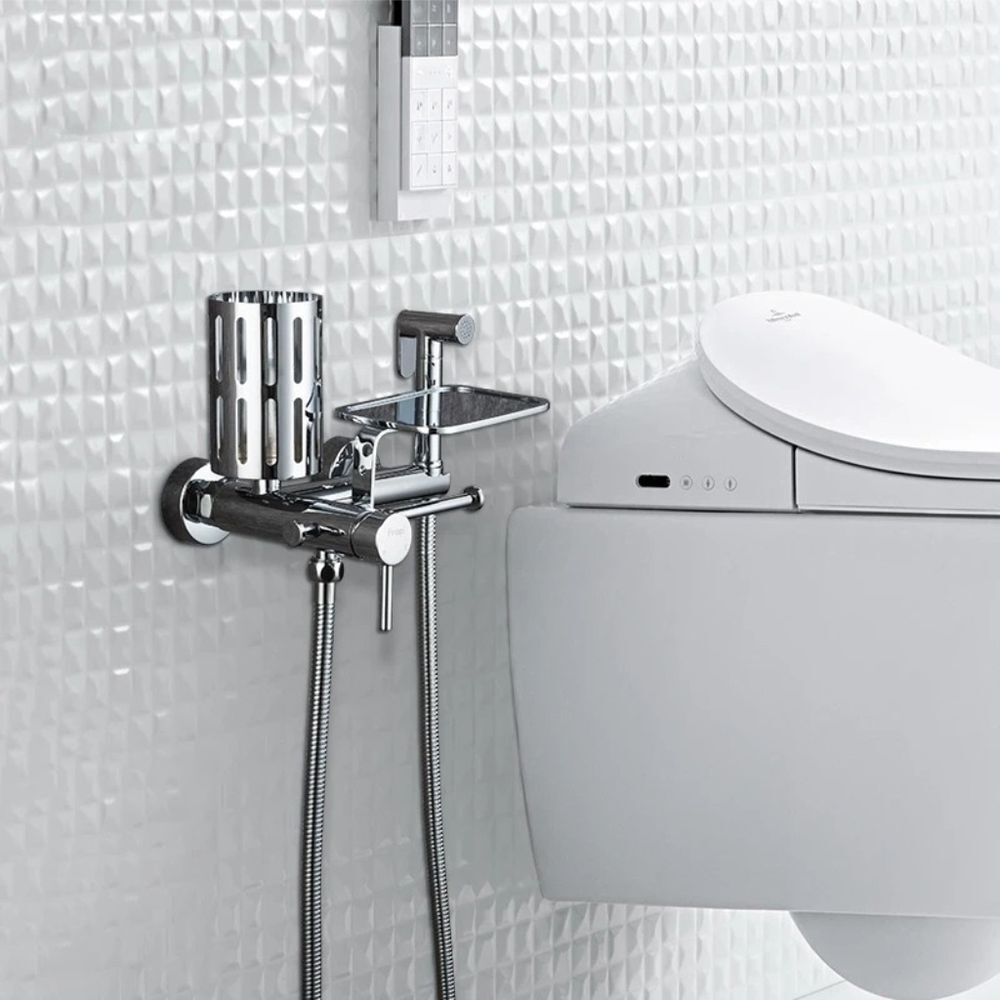 В комплекте: смеситель, душевой шланг, гигиеническая лейка, держатель лейки, крепление, полочка, бумагодержатель, держатель освежителя воздуха