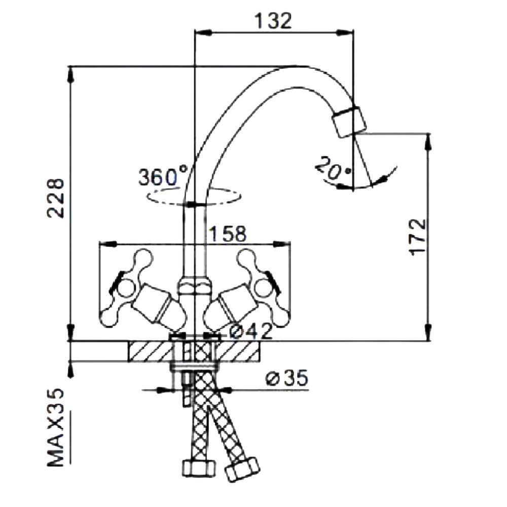 Frap смеситель для кухни, излив высокий, поворотный, двухвентильный, керамические кран-буксы, покрытие хром, крепление шпилька, гибкая подводка 1/2.