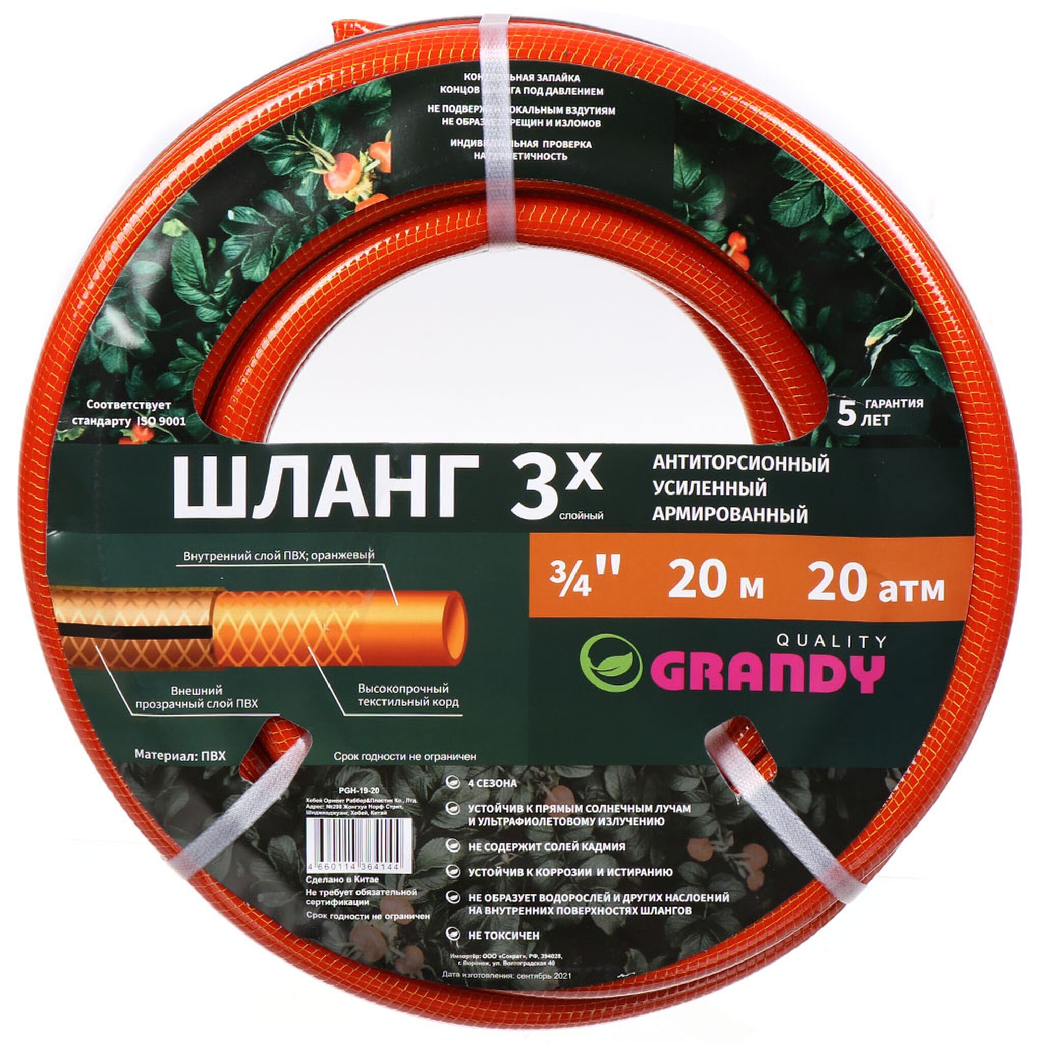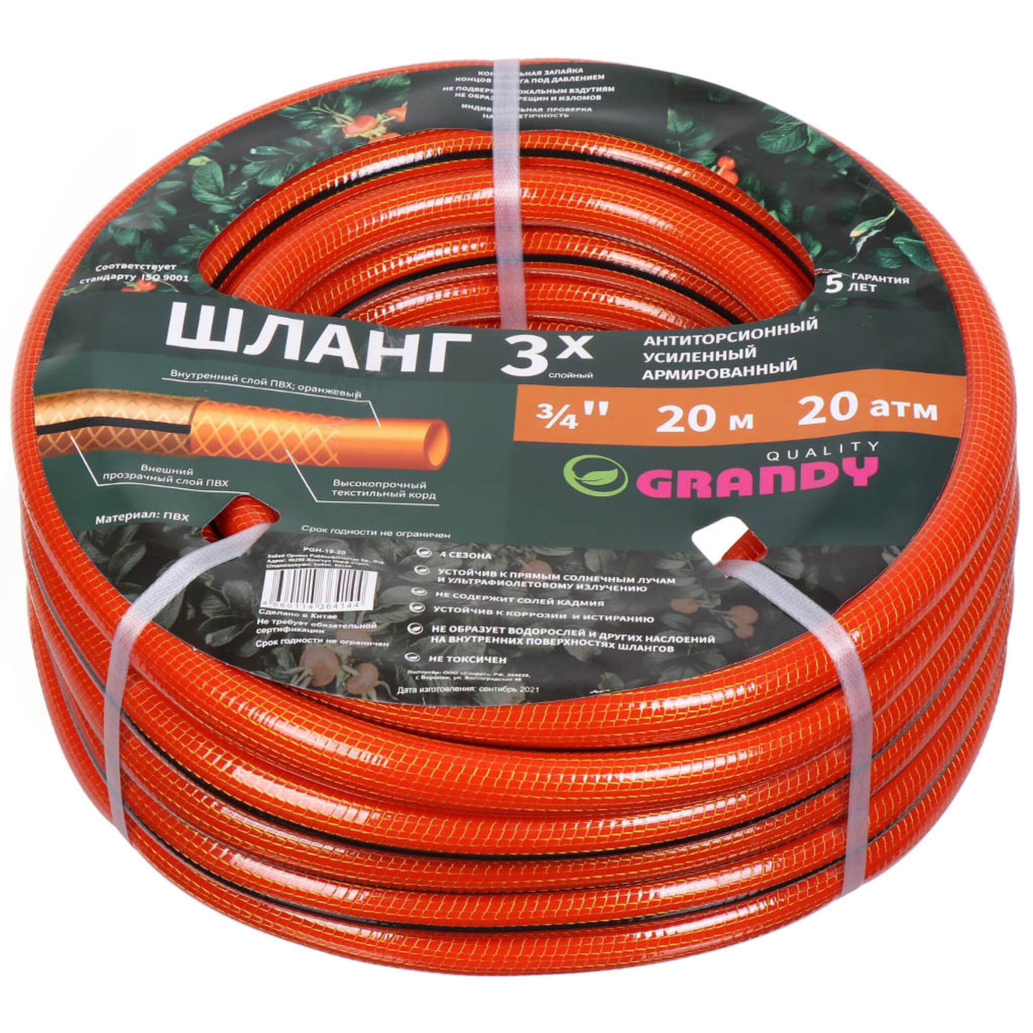 Шланг поливочный армированный Grandy не подвержен локальным вздутиям, не образует трещин и изломов. Проверен на герметичность.