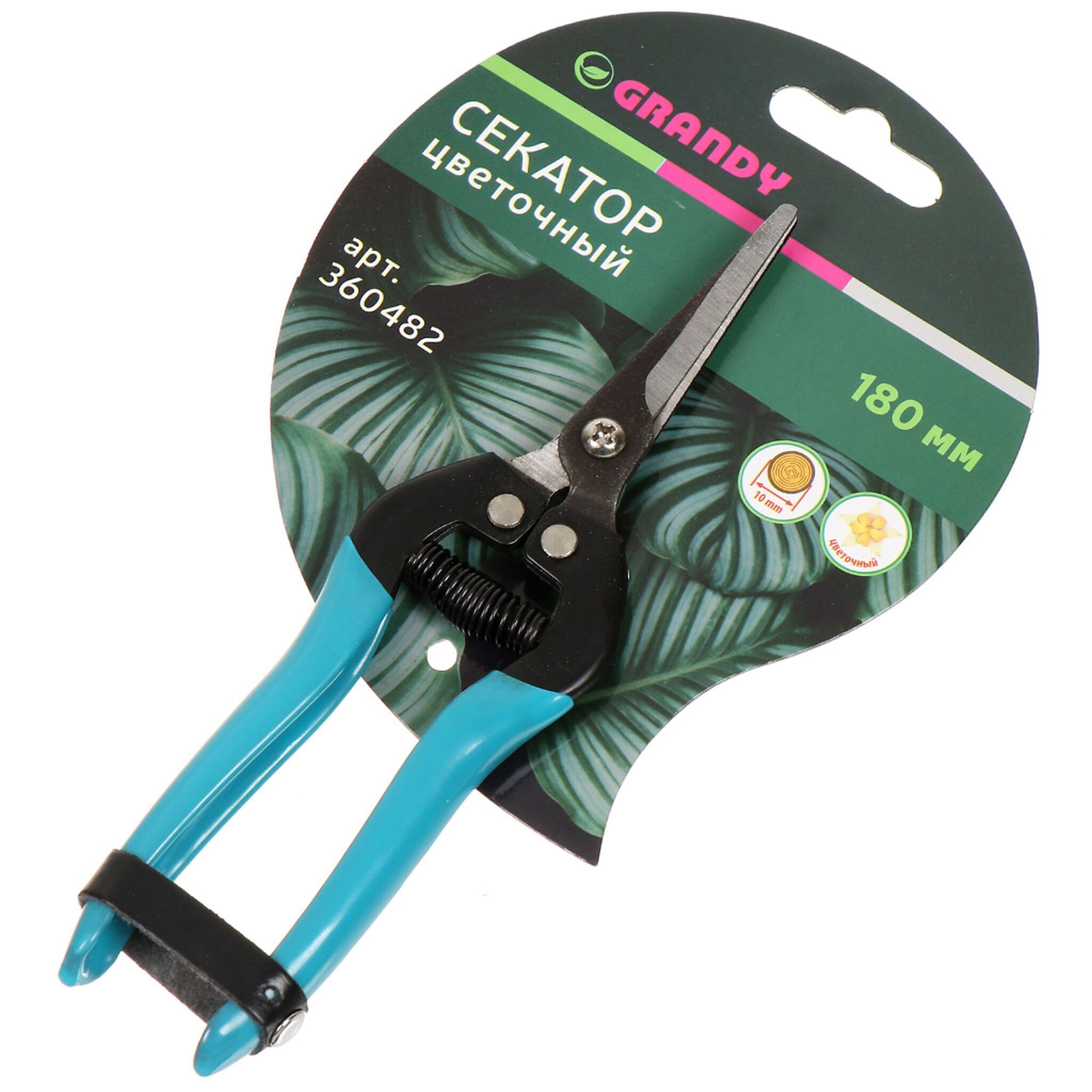 Цветочный секатор с прямым резом, обрезиненными рукоятками и петлевым фиксатором, расположенным на конце одной из рукояток. Предназначен для ухода за цветами и растениями. Режущие лезвия изготовлены из инструментальной стали У8, остро заточены и имеют оксидированное покрытие для защиты от коррозии.