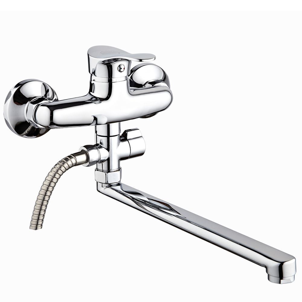 Смеситель для ванны "РМС" с длинным изливом предназначен для смешивания холодной и горячей воды, устанавливается на мойку. Выполнен из высококачественной латуни марки MS63 (63% медь, 36% цинк, свинец, железо, сурьма, висмут, 1% фосфор). Такая латунь обладает повышенной прочностью, коррозионной стойкостью, твердостью и устойчивостью к щелочам и разбавленным кислотам.