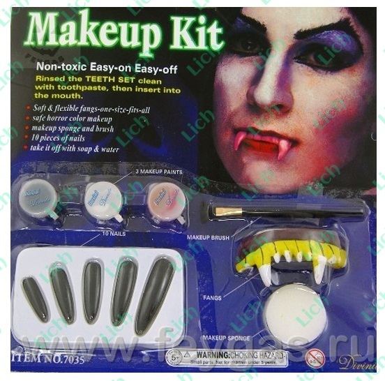 Набор Грим для вампира состоит из: · челюсти · накладных когтей · кисточки для нанесения грима · краски для лица