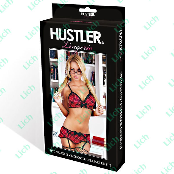 Сексуальный ролевой комплект белья из двух предметов - бюстгальтера и юбочки с пажами для чулок. Белье изготовлено из гладкого материала с принтом в клеточку. Чашки лифа обшиты кружевом, широкая резинка под чашками украшена рюшей и большим бантом из атласа спереди. Бретели регулируются по длине. Юбочка-пояс сидит на бедрах, высота пажей регулируется. Низ оторочен черной рюшей. Спереди и сзади на поясе юбка украшена черными бантиками. Материал: полиэстер.