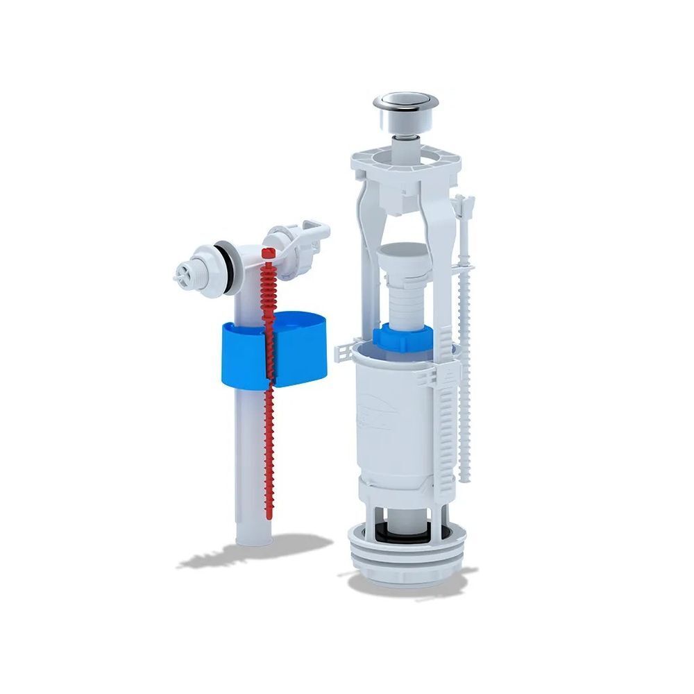 Набор для бачка унитаза. Наливной механизм с боковой подводкой и пластиковой резьбой диаметром 1/2. Сливной механизм метализированная кнопка с одним режимом слива эконом