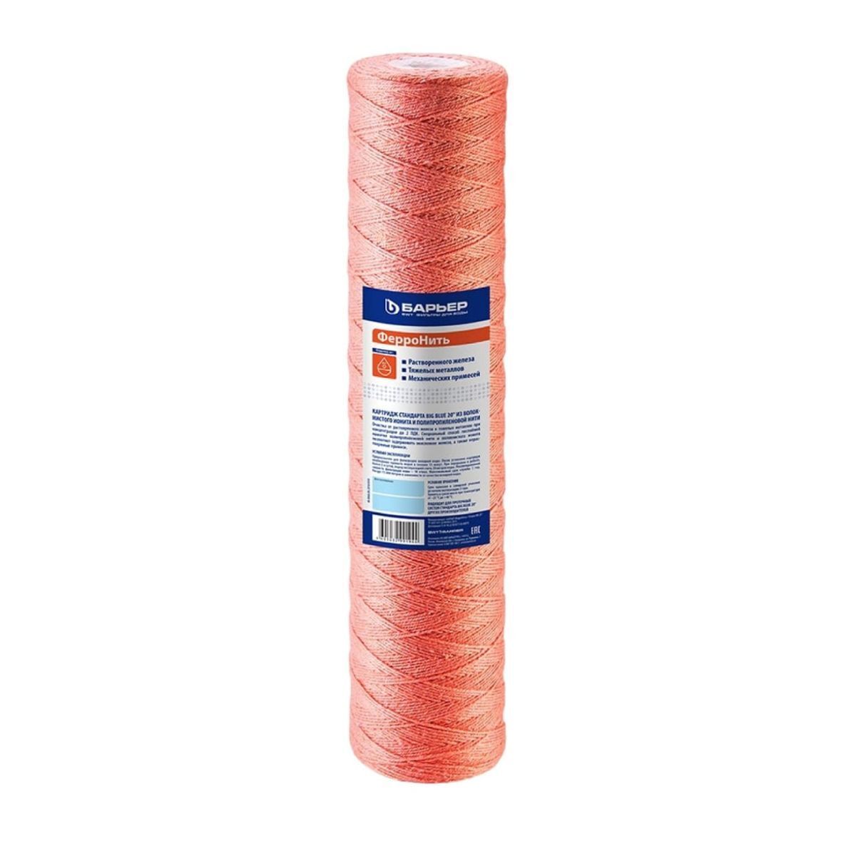 Фильтроэлемент ФерроНить BB 20 Барьер Р542Р01 предназначен для очистки холодной воды от растворенного железа, тяжелых металлов и нерастворимых механических загрязнений. Изготовлен из волокнистого материала и полипропиленовой нити. Используется в магистральных фильтрах Барьер стандарта Big Blue 20.