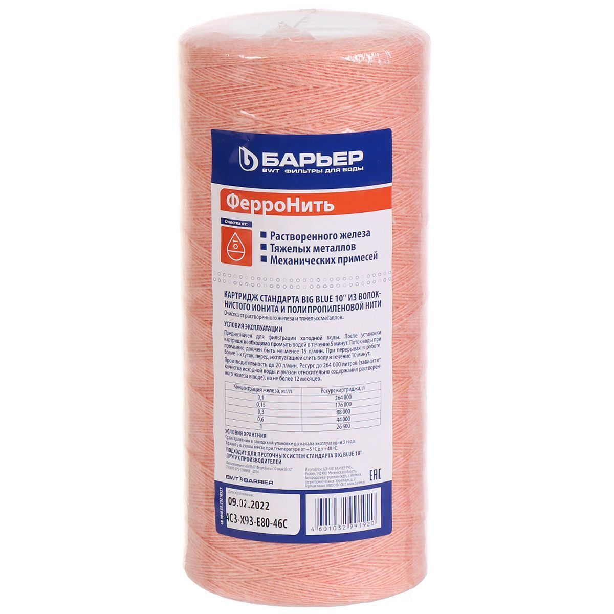 Картридж БАРЬЕР «Ферронить» эффективно удаляет механические частицы от 10 мкм, примеси растворенного и коллоидного железа, а также справляется с тяжелыми металлами.