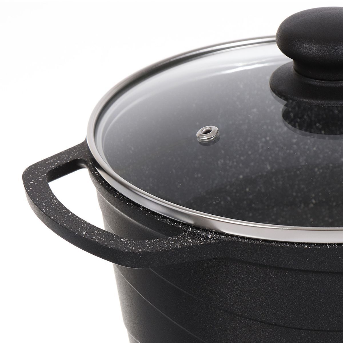 Качественное антипригарное покрытие с эффектом натурального камня «Черный гранит» позволяет избежать пригорания продуктов даже без использования масла. Покрытие на водно-кремниевой основе не содержит PFOA (перфтороктановую кислоту), безопасно для контакта с пищевыми продуктами, а также в производстве и для окружающей среды. Кастрюля комплектуется крышкой из жаростойкого стекла с ободом из высококачественной нержавеющей стали.