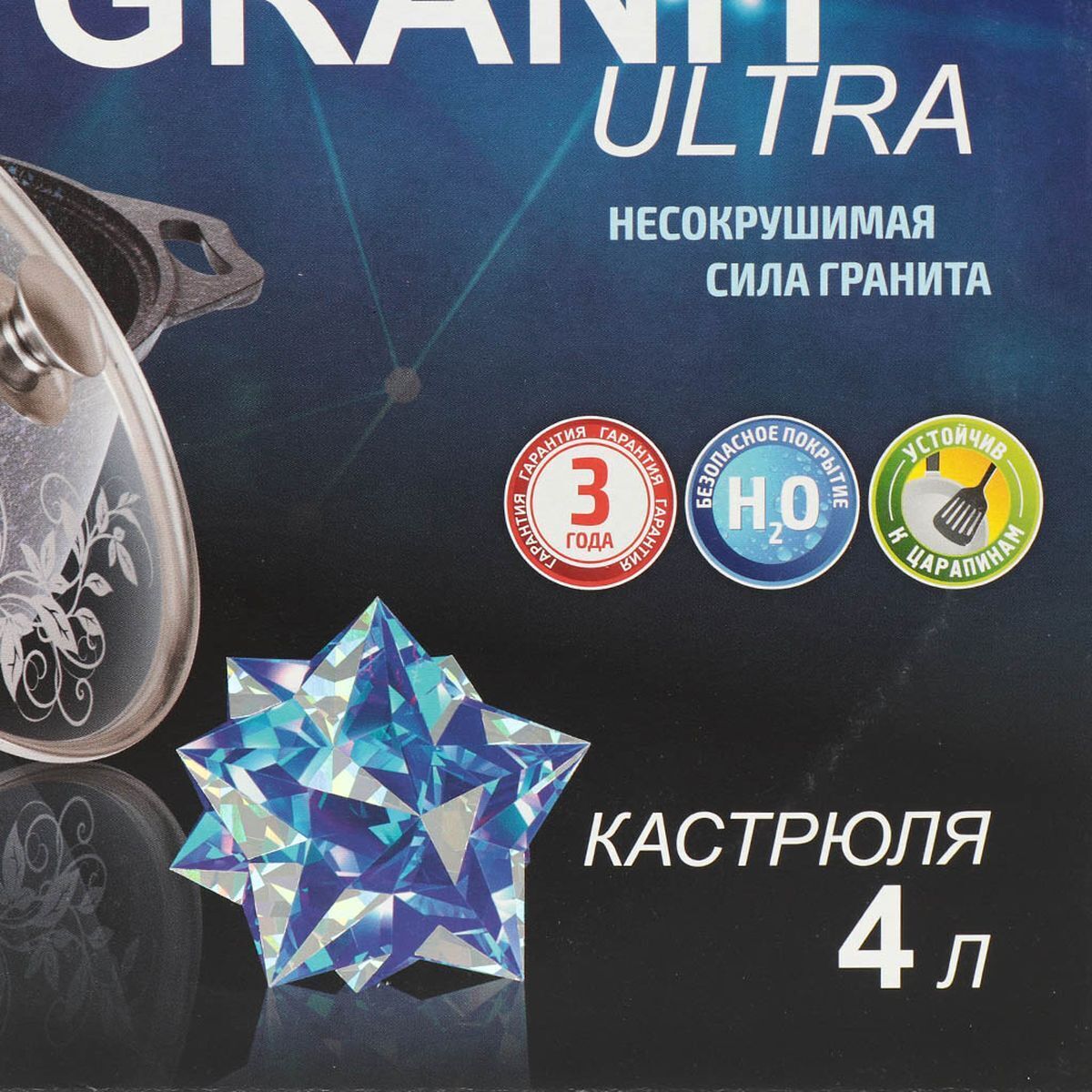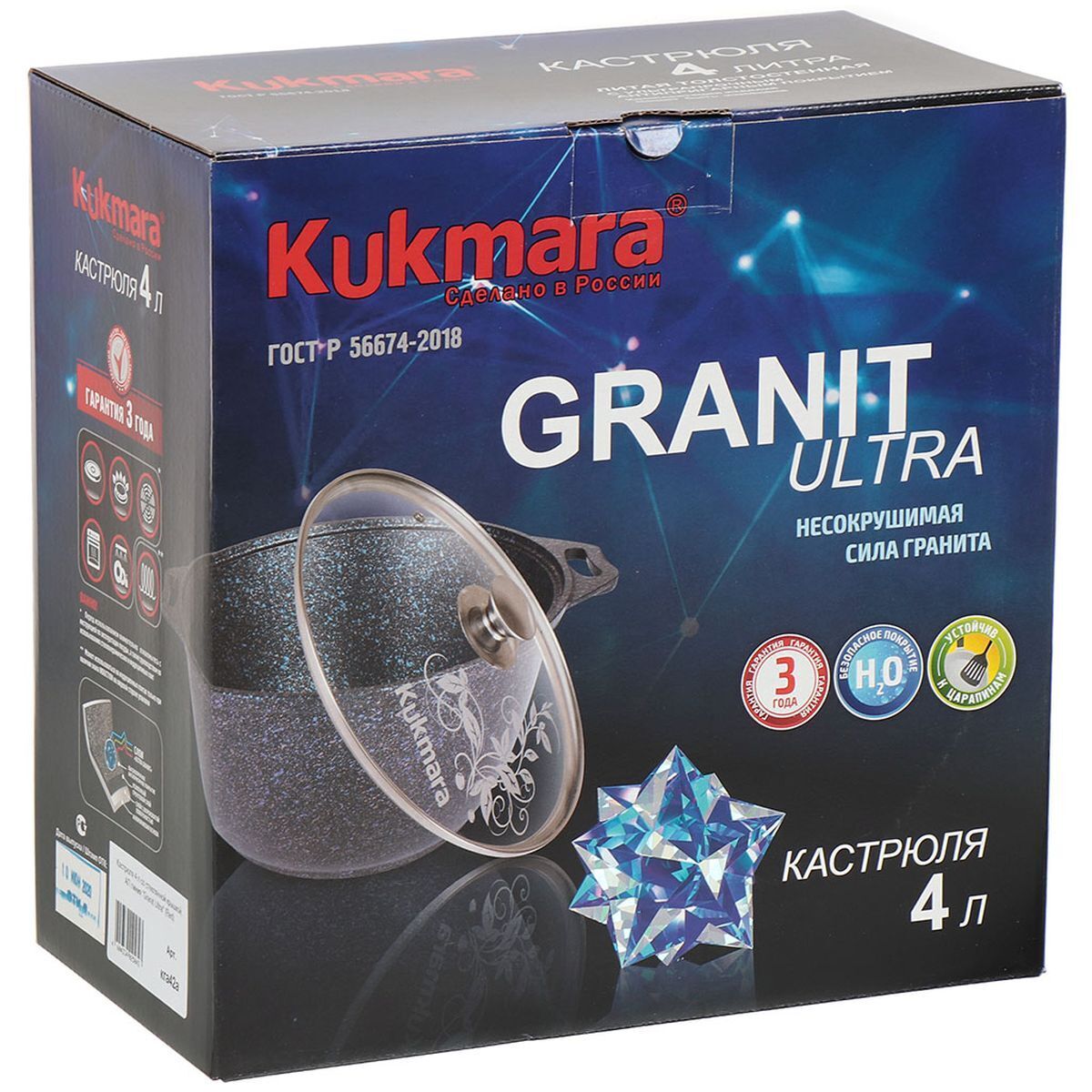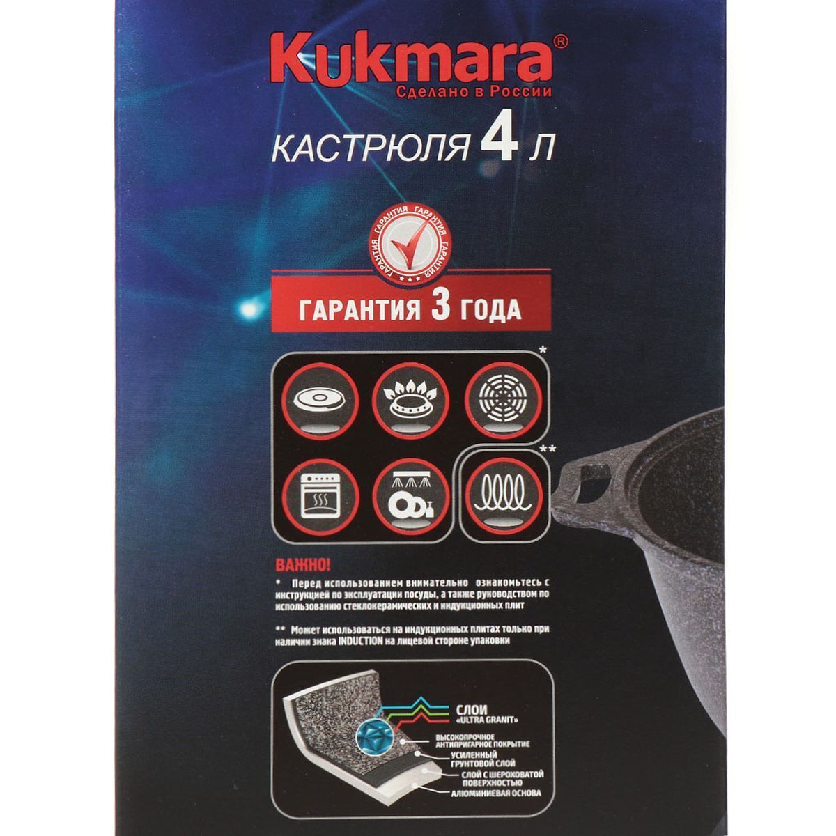 Кастрюля с алмазным покрытием "Kukmara" изготовлена из литого алюминия и покрыта уникальным ультрапрочным антипригарным покрытием «Ultra granit». «Ultra granit» - это инновационное невероятно прочное покрытие, усиленное сверхтвердыми минералами нового поколения, близкими по твердости алмазу. Благодаря особой технологии, разработанной немецкой фирмой «Weilburger Coatigs Gmbh», прочность покрытия позволяет использовать даже металлические кухонные принадлежности, не боясь повредить поверхность. Покрытие «Ultra granit» продлевает срок службы посуды более чем в 7 раз!