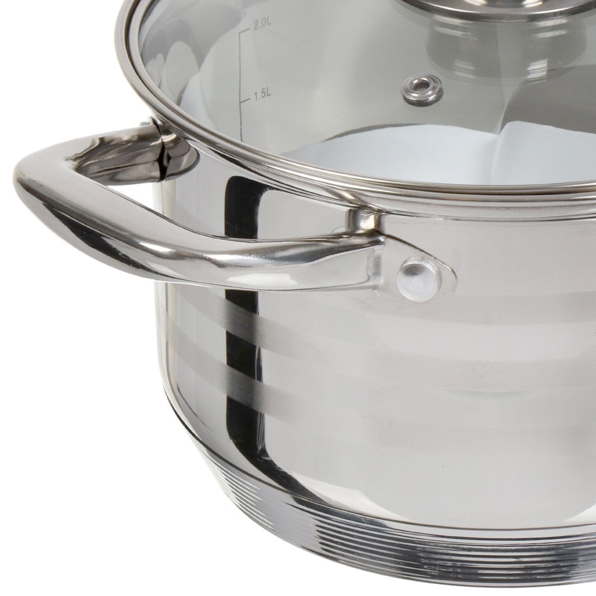 Крышка выполнена из термостойкого закаленного стекла, снабжена металлическим ободком для прочности и плотного закрывания и пароотводом. Широкие эргономичные ручки позволяют легко и удобно перемещать кастрюлю.