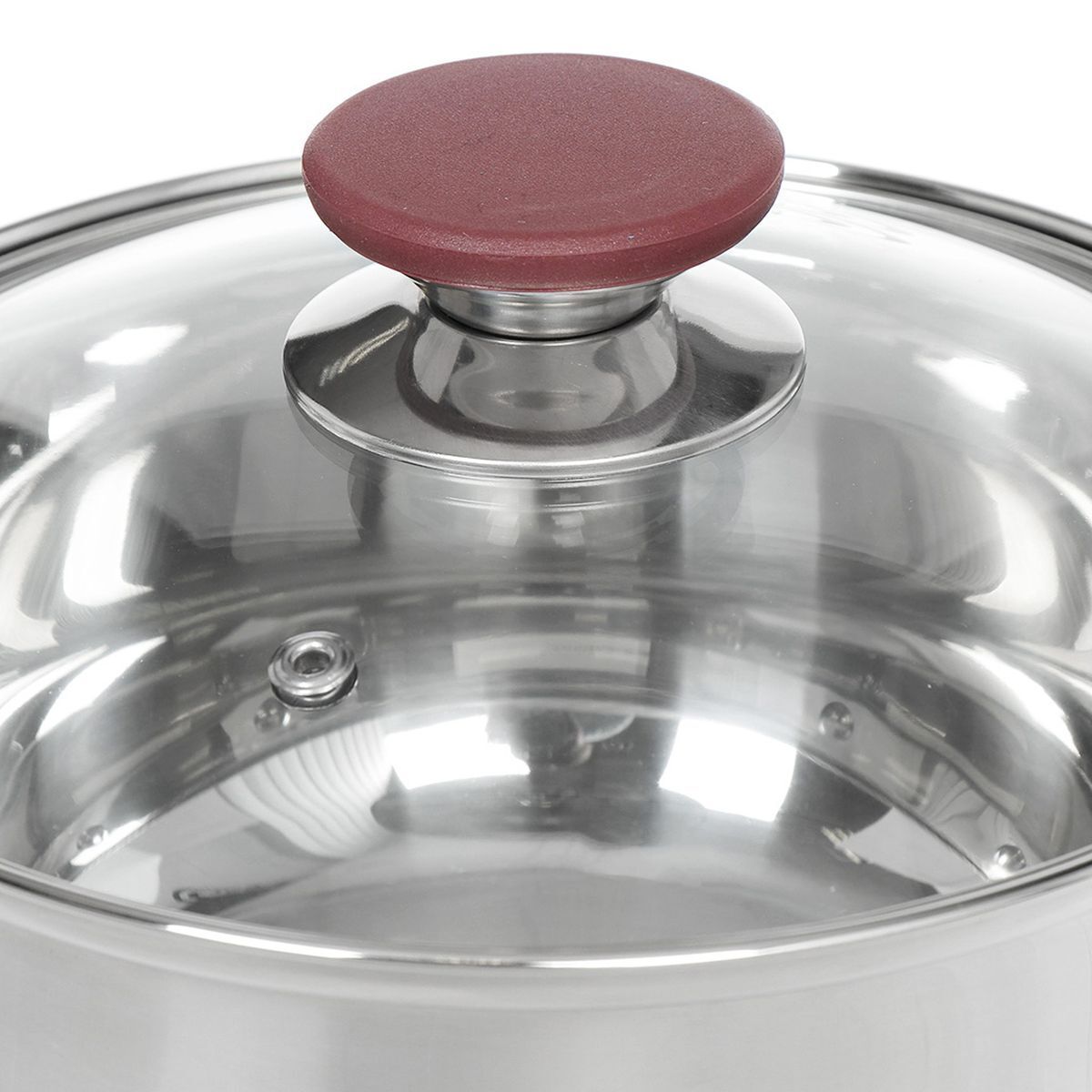 Кастрюля оснащена удобными ручками из нержавеющей стали, прикрепленными методом клепочной фиксации. Крышка оснащена отверстием для выхода пара. Форма кромки кастрюли предотвращает разливание жидкости, а благодаря правильности линий кромки в комбинации с крышкой обеспечивается максимальная герметизация между ними.