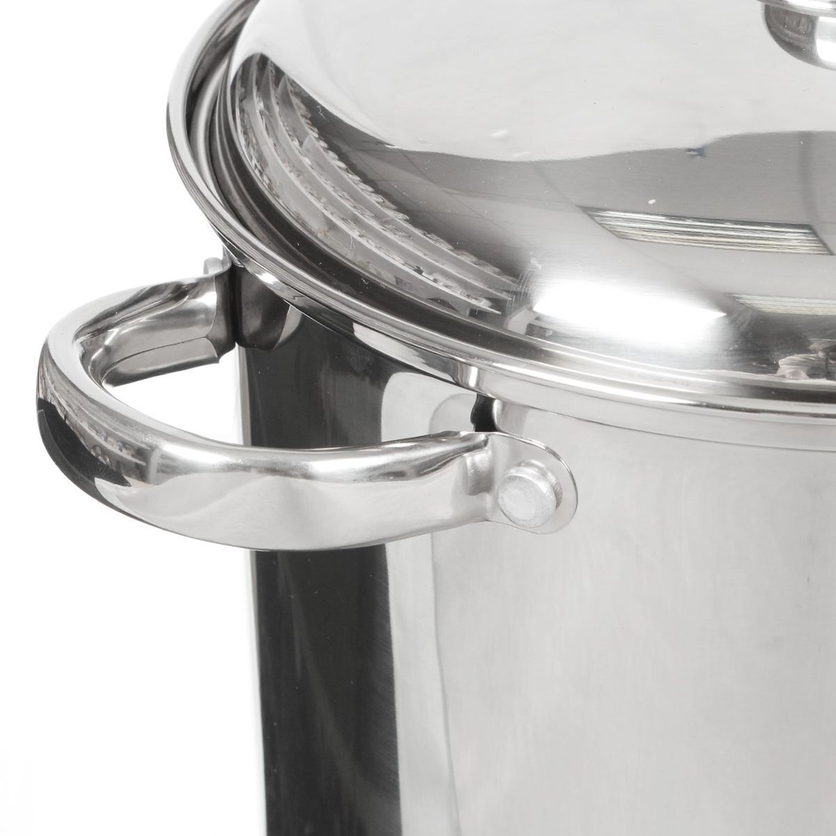 Кастрюля оснащена удобными ручками из нержавеющей стали. Ручки прикреплены методом клепачной фиксации. Крышка оснащена отверстием для выхода пара. Ручки прикреплены методом клепачной фиксации. Форма кромки кастрюли предотвращает разливание жидкости, а благодаря правильности линий кромки в комбинации с крышкой обеспечивается максимальная герметизация между ними.