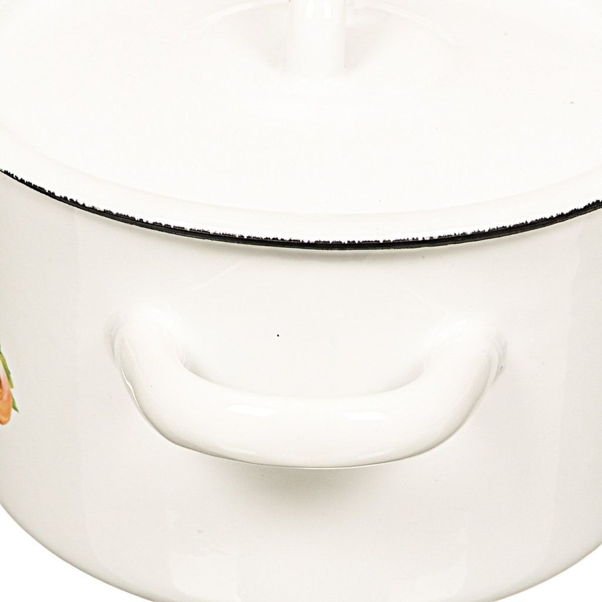На дне изделий без ободка допускаются «точки» - следы от иголок, на которые изделие ставится и обжигается в печи. На изделиях с ободком таких следов нет, т.к. для обжига они ставятся вверх дном, а борт затем закрывается ободком из нержавеющей стали.