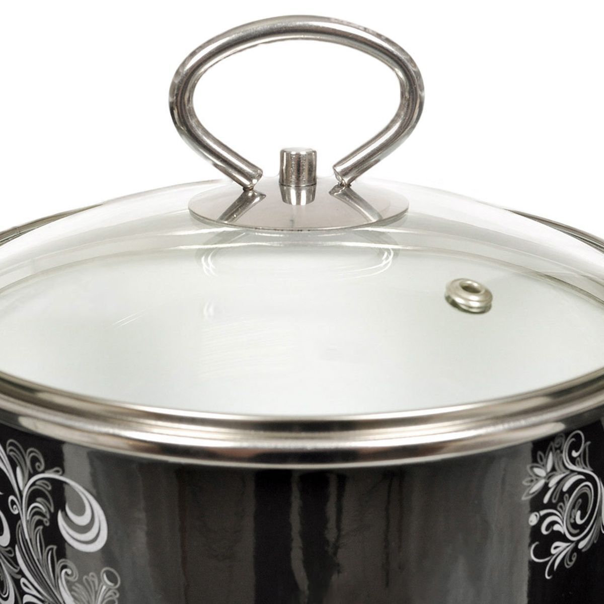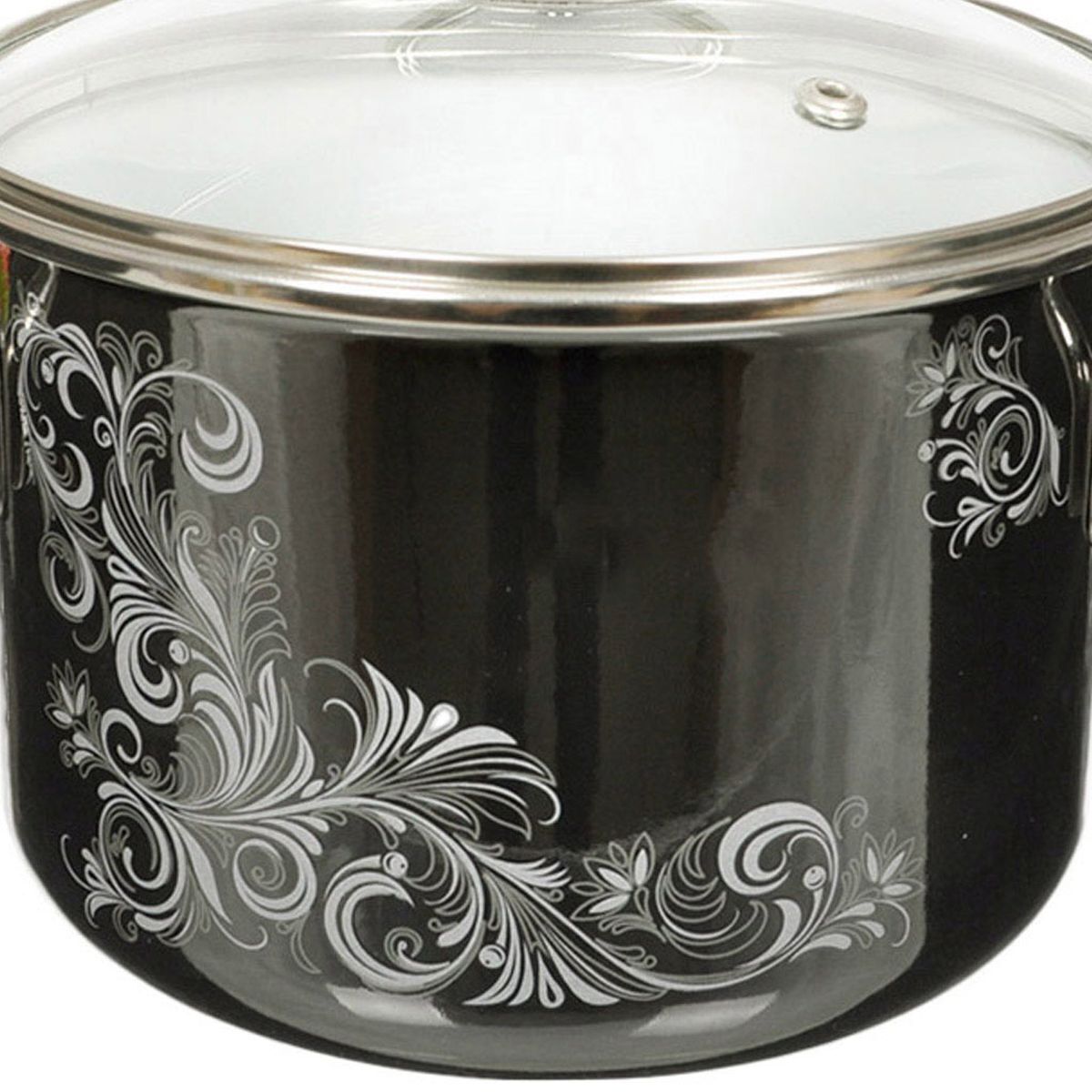 Кастрюля оснащена стеклянной крышкой с металлическим ободом и пароотводом, а также удобными стальными ручками.