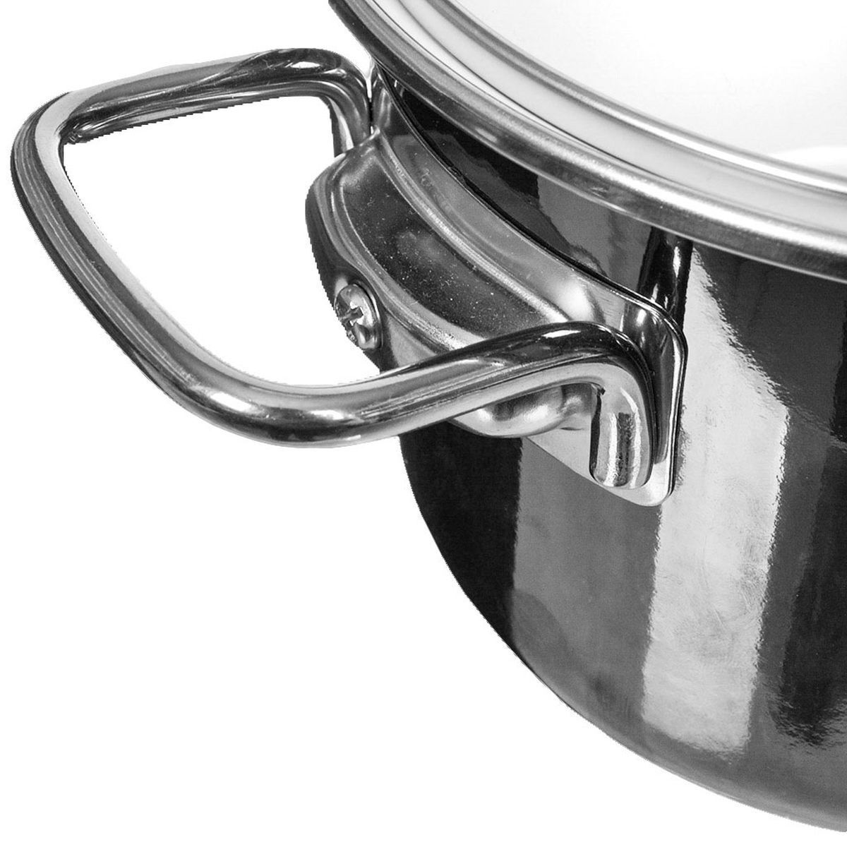 Кастрюля оснащена стеклянной крышкой с металлическим ободом и пароотводом, а также удобными стальными ручками.