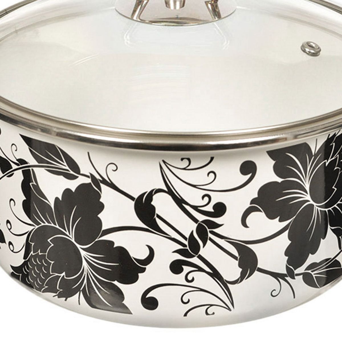 Кастрюля оснащена стеклянной крышкой с металлическим ободом и пароотводом, а также удобными стальными ручками.