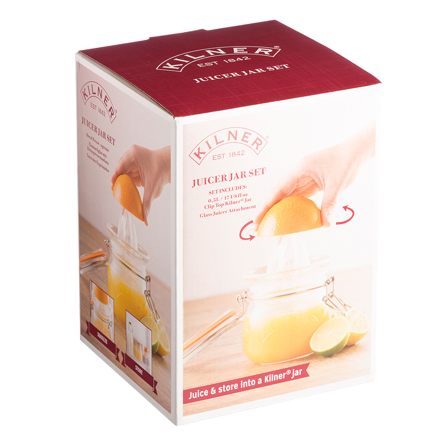 Банка со съёмной соковыжималкой и защелкивающейся крышкой. Крышка плотно прилегает к краям банки благодаря силиконовой прокладке и металлическому замку. Это позволяет сохранить продукты свежими долго время. Соковыжималка подходит к банкам Kilner Clip Top объёмом 0,5 л, 1 л, 1,5 л и 2 л. Банка упакована в подарочную коробку и станет прекрасным подарком любой хозяйке. В комплект также входит буклет с рецептами.