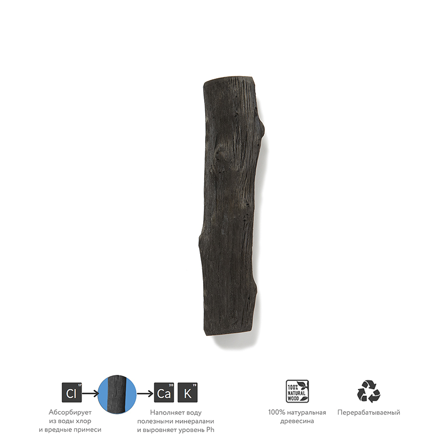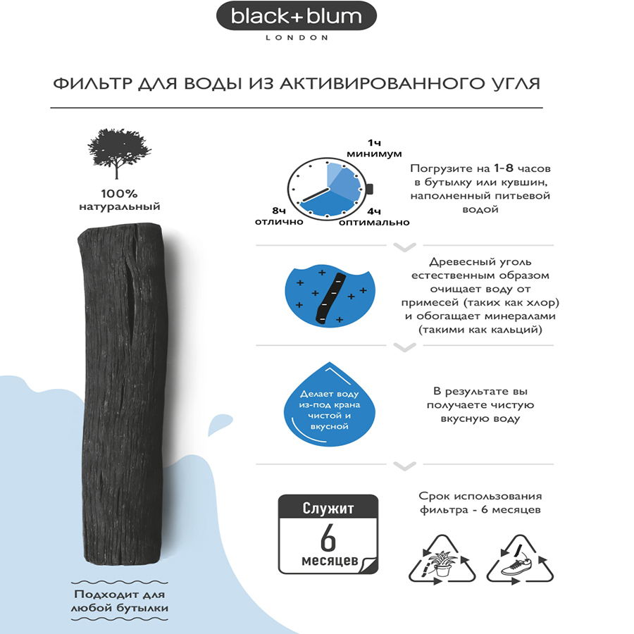 Фирменный угольный фильтр Binchotan от Black+Blum производится и работает по старинной японской технологии. Для начала очищения положите его в бутылку с водой и оставьте на 6-8 часов. Используйте его таким образом 3 месяца, затем прокипятите 10 минут и используйте еще 3 месяца. По истечении этого времени уголь эффективно утилизируется в качестве подкормки для домашних растений. Фильтр можно положить в любую емкость. Он идеально помещается в фирменные эко-бутылки и фляги Black+Blum со специальными широкими горлышками.