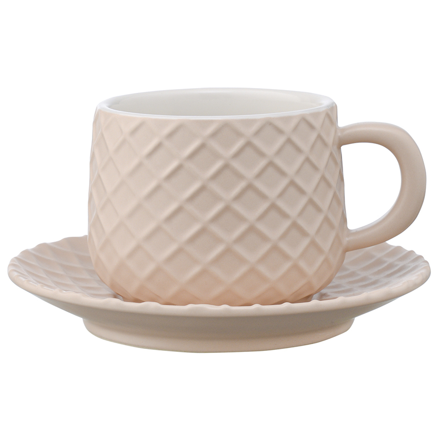 Чайная пара из коллекции Marshmallow – оптимальный вариант для тех, кто предпочитает сочетание практичности и необычного дизайна. Чашка и блюдце выполнены из каменной керамики с отличными эксплуатационными свойствами, среди которых экологичность, устойчивость к износу и температурным перепадам. Материал не впитывает запахи и загрязнения. Глазурованное покрытие легко очищается, обеспечивает изделиям декоративный вид и защищает от внешних воздействий. Узор, напоминающий соты, и интересная утолщенная ручка придают посуде особый шарм.
