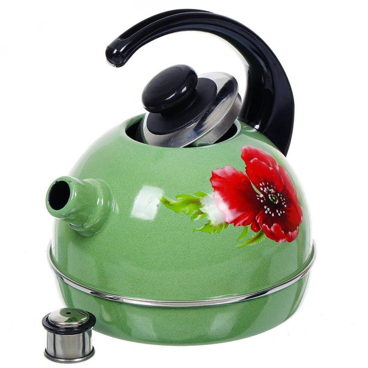 Чайник изготовлен из высококачественного стального проката, что обеспечивает долговечность использования. Внешнее эмалевое покрытие не вступает во взаимодействие с пищевыми продуктами. Такое покрытие защищает сталь от коррозии, придает посуде гладкую стекловидную поверхность и надежно защищает от кислот и щелочей. Чайник оснащен фиксированной ручкой из пластика и крышкой, которая плотно прилегает к краю. Носик чайника оснащен съемным свистком, звуковой сигнал которого подскажет, когда закипит вода.