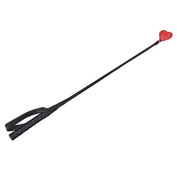 Черный длинный кроп из пластмассы, ручка и ствол которого обшиты и оплетены черным полиуретановым материалом, имитирующим кожу. На рукояти дополнительная петля для удобства. Размер красного сердца 5 х 5 см. Общая длина: 68 см.