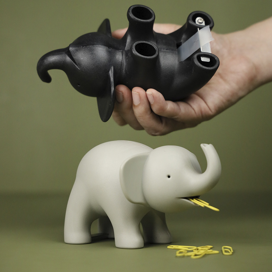 Долой серость и скуку из офиса! Необычное и полезное решение для рабочего стола – обаятельный слон в два счета поможет справиться с неудобным липким скотчем. Катушка помещается внутрь аксессуара. Лента крепится на специальный держатель в лапах животного, что избавляет от утомительного поиска ее конца. Зазубренное лезвие помогает ровно оторвать кусок скотча нужного размера. Изделие выполнено из экологичного АБС-пластика. Материал безвреден для окружающей среды, не содержит бисфенол-А, устойчив к износу, подходит для вторичной переработки и не требует сложного ухода.