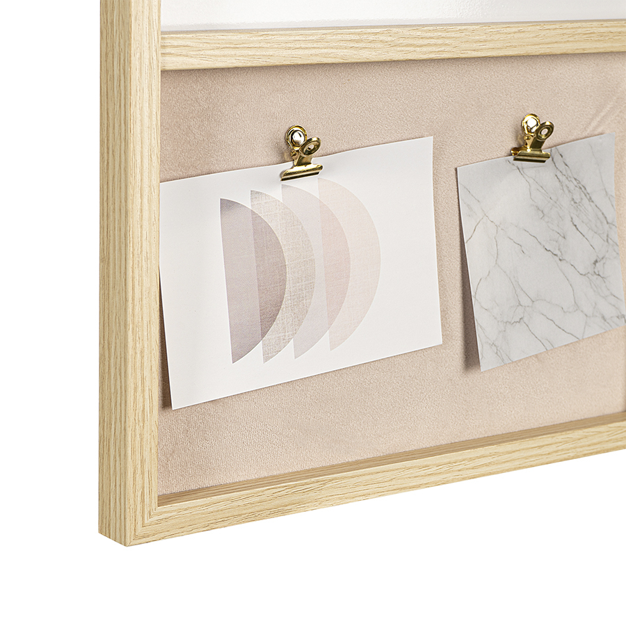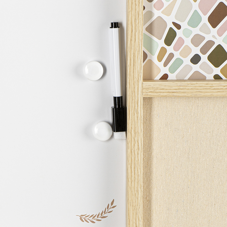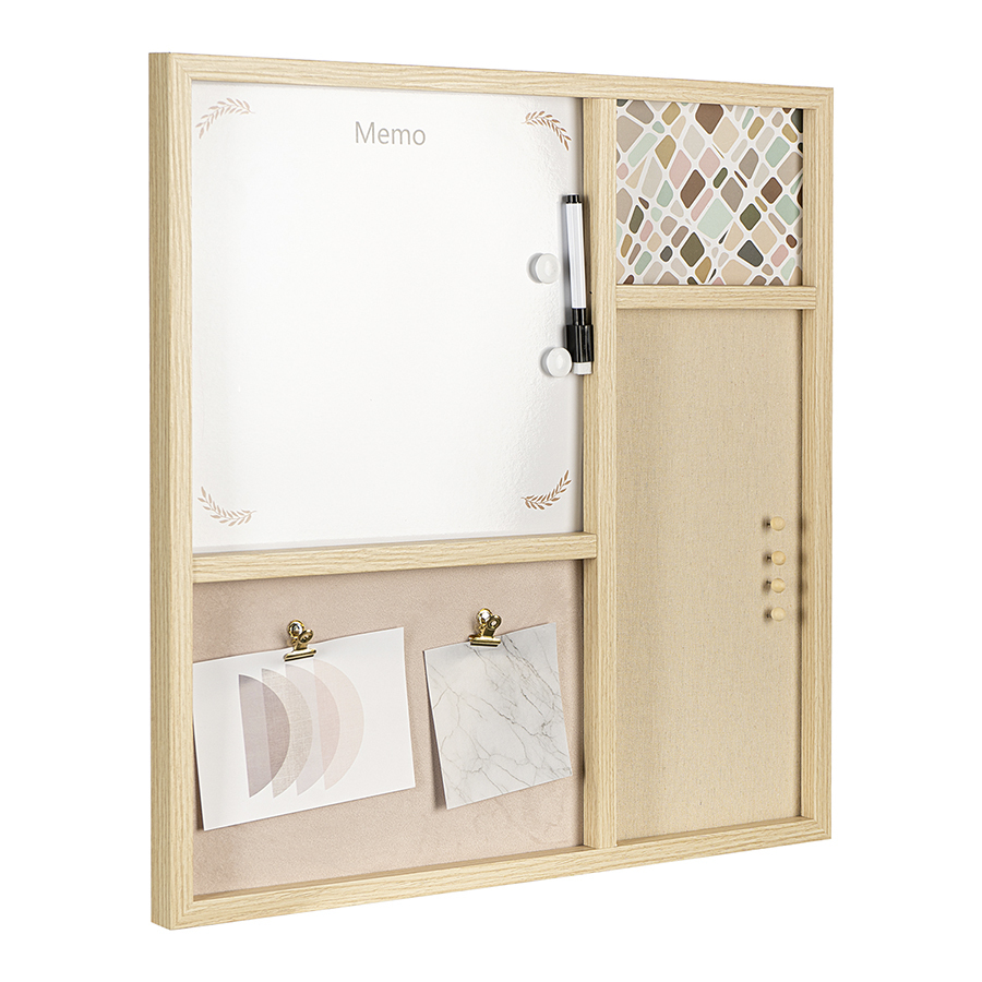 Доска для заметок Memo совмещает в себе три типа покрытий: пробковое, текстильное и поверхность для маркера. Такой стенд позволяет не только записывать информацию, но и крепить напоминания в виде заметок из бумаги и других материалов.