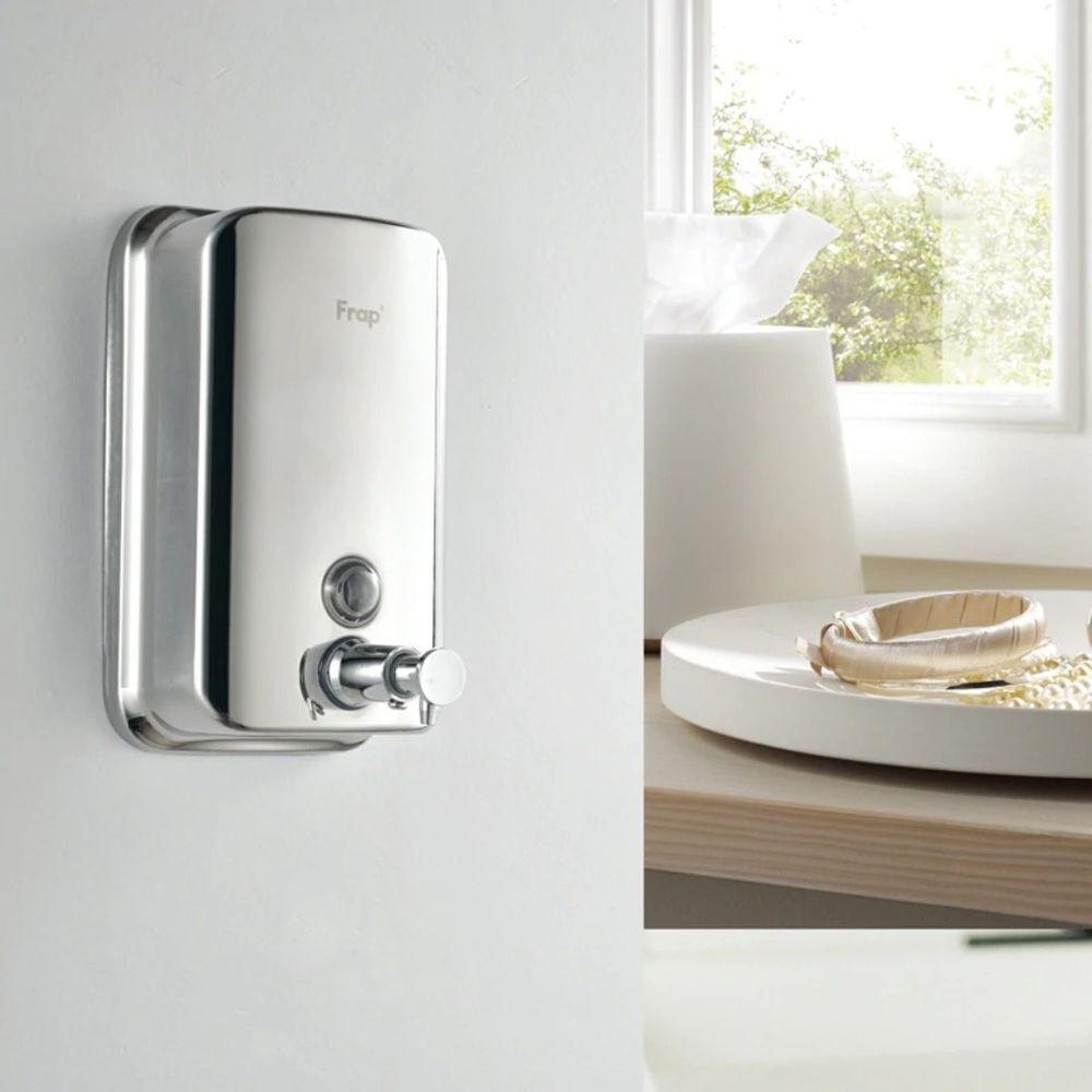Дозатор для жидкого мыла Frap F402 отличается стильным дизайном в сочетании с высоким уровнем практичности, функциональности и надёжности. Устанавливается на стену посредством шурупов или саморезов. Хромированное покрытие корпуса позволяет органично вписываться в современные интерьеры ванных комнат. Объём резервуара 800 мл.