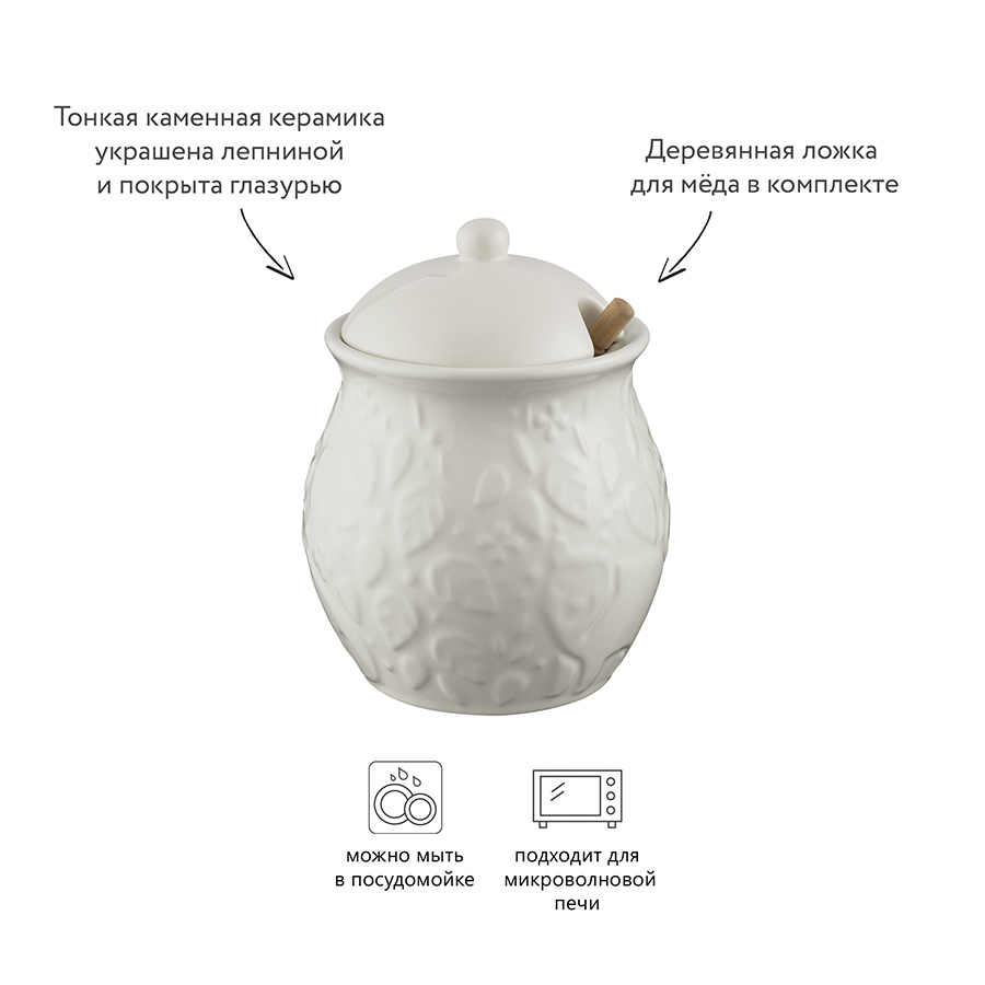 Емкость для меда In the Forest – удобный аксессуар, который гармонично впишется в интерьер любой современной кухни. Создавая посуду этой коллекции, дизайнеры вдохновлялись народными сказками середины XIX века. Изделие из тонкой каменной керамики покрыто высокопрочной глазурью, устойчивой к образованию царапин. В комплект входит удобная деревянная ложка. Емкость идеально подойдет для хранения и подачи меда, сиропа и патоки. Посуду можно мыть вручную или в посудомоечной машине.