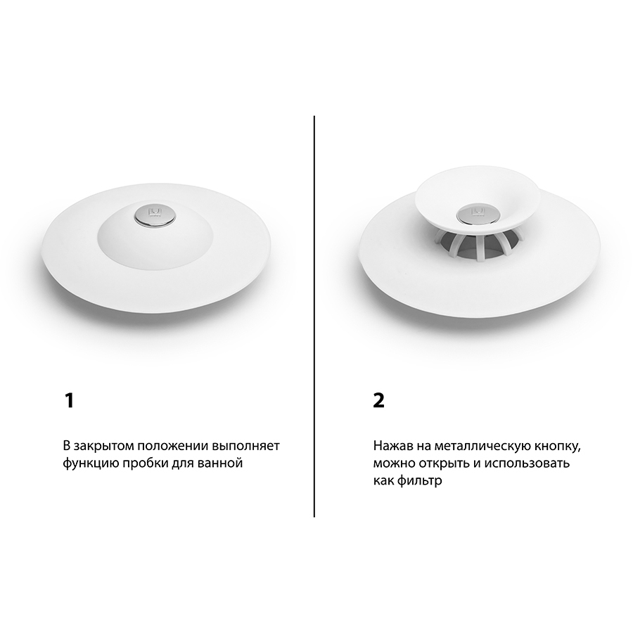 Нажмите на металлическую кнопку в центре, чтобы вода сливалась через фильтр, задерживая в нем мусор. Нажмите на силиконовые крылышки вокруг кнопки, и фильтр закроет слив, чтобы вы смогли наполнить ванну. Сочетается с другими аксессуарами из коллекции Flex.