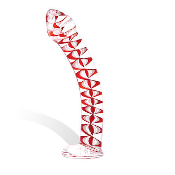 Изящный изогнутый фаллоимитатор на плоской подставке с внутренней красно-белой узорчатой спиралью. Плавная головка увенчивает этот красивейший фаллос. Длина фаллоса от подставки: 20 см. Диаметр: 2,8 см.